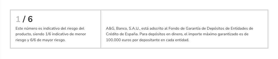 - Seguridad: cubierto hasta 100.000 € por el Fondo de Garantía de Depósitos (FGD) por titular y cuenta en A&G, entidad financiera especializada en gestión patrimonial, con un ratio de solvencia de 19,6 % (ratio CET1 a cierre de diciembre de 2023 ) muy por encima del promedio español (12,6 % del sector bancario español, datos a diciembre de 2023).